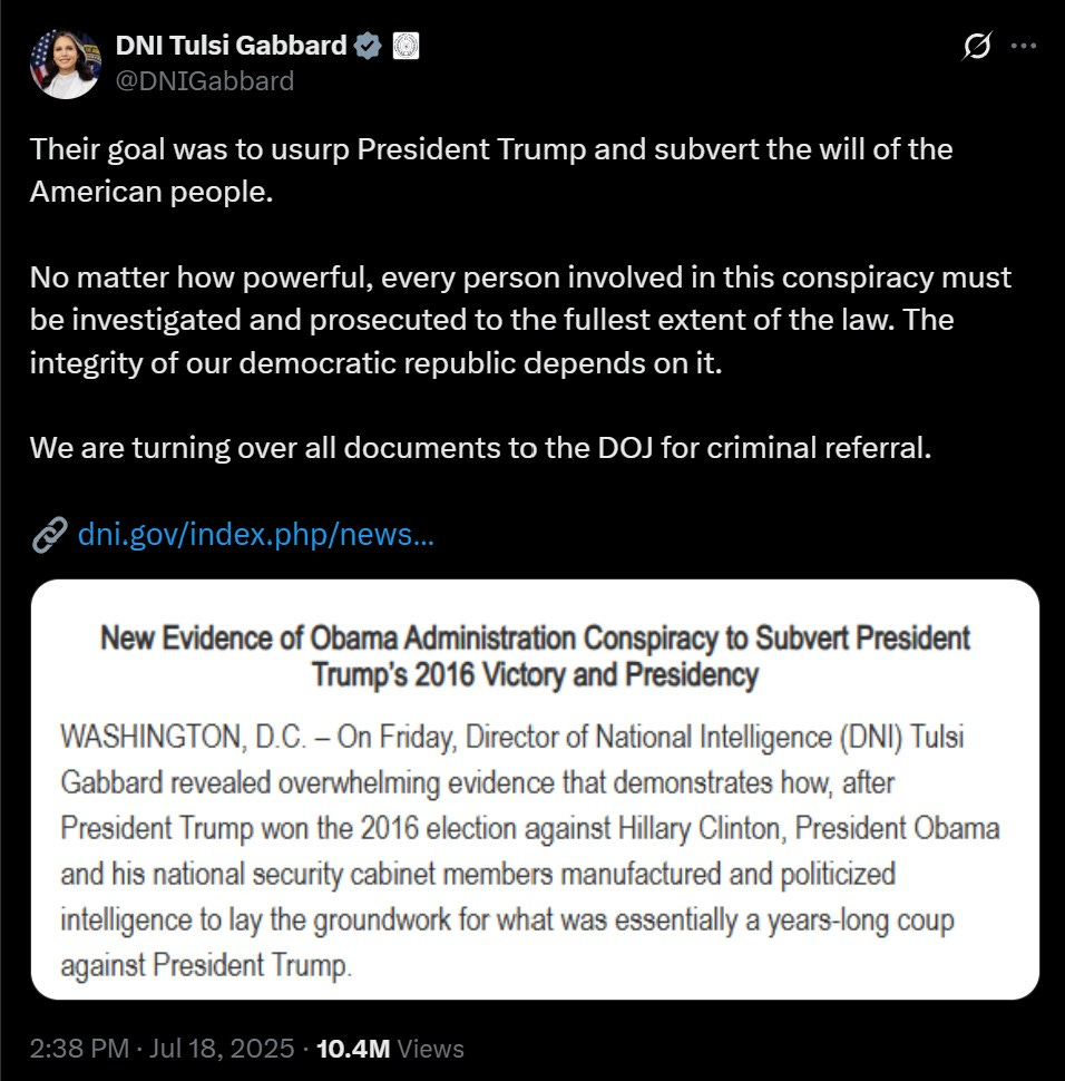 Director of National Intelligence Tulsi Gabbard is demanding criminal prosecution of former President Barack Obama and his top administration officials, alleging they ran a “treasonous conspiracy” to sabotage Donald Trump’s presidency by fabricating intelligence about Russian interference for the purpose of sabotaging a presidency, defying the will of the American people, and undermining a duly elected president.