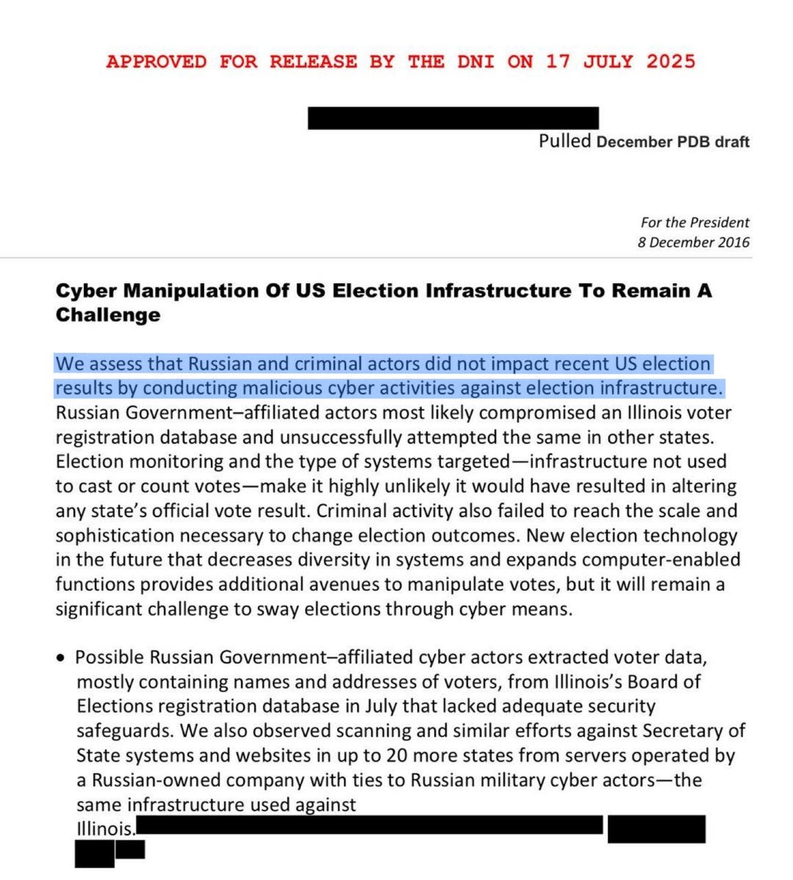 One internal memo prepared for then-DNI James Clapper on December 7, 2016, stated clearly: “Foreign adversaries did not use cyberattacks on election infrastructure to alter the US Presidential election outcome.”